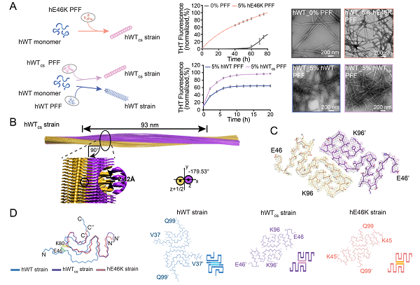 在本工作中,研究者首先通过脑立体定位注射α-syn 病理性纤维构建了PD小鼠模型,发现E46K纤维能够引发小鼠早发性运动缺陷,且在小鼠脑内引发内源α-syn形成大量病理性聚集体。相比于WT α-syn纤维,E46K纤维诱导内源性α-syn产生更多,尺寸更小的聚集体且其多分布于神经突而非胞体,该聚集体传播到相连脑区如黑质也更加高效,显示出更强的流动性和细胞间传播的能力。更有意思的是,研究者发现,在体外用E46K纤维作为种子能够有效地诱导WT α-syn形成类似于E46K纤维结构的纤维(图1),且其同样能在体内引起类似E46K纤维的病理变化。