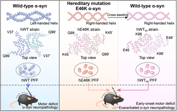2021年5月11日,中国科学院上海有机化学研究所生物与化学交叉中心刘聪课题组与何凯雯课题组合作成果在Proceedings of the National Academy of Sciences of the United States of America上在线发表,题为:Wild-type α-synuclein inherits the structure and exacerbated neuropathology of E46K mutant fibril strain by cross-seeding。该工作发现α-突触核蛋白(α-synuclein, α-syn)的家族性突变E46K诱导其形成具有比野生型(wild-type, WT)纤维更强病理毒性的病理性纤维,导致小鼠出现早发性运动缺陷。更为重要的是,E46K纤维可以通过交叉接种(cross-seeding)的方式,诱导WT α-syn形成类似E46K的纤维结构(hWTcs纤维),且hWTcs纤维可诱发小鼠表现出类似E46K纤维的病理特征和早发运动障碍。该工作为理解α-syn纤维形成的选择性以及家族性帕金森病(familial Parkinson’s disease, fPD)的致病机理提供了新的视角。