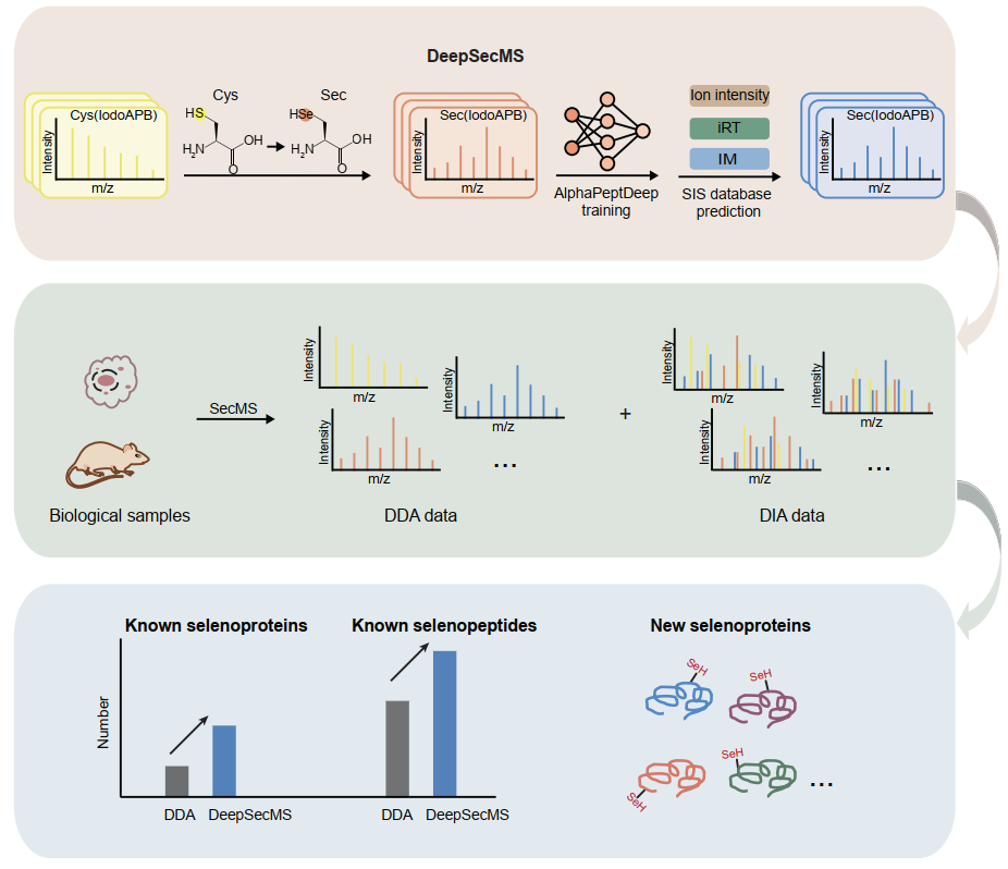 中国科学院上海有机化学研究所生物与化学交叉研究中心张耀阳课题组在前期研究中,开发了Sec特异性的质谱方法(Sec-specific mass spectrometry, SecMS)和非SECIS依赖的硒蛋白数据库(SECIS-independent selenoprotein database, SIS)(PMID: 30174312),首次在小鼠中绘制了组织特异性的硒蛋白图谱,并发现了多个新的硒蛋白,该成果为系统性研究硒蛋白质组提供了重要的理论和数据基础。近日,张耀阳课题组在 Advanced Science上发表了一篇题为“DeepSecMS Advances DIA-Based Selenoproteome Profiling Through Cys-to-Sec Proxy Training”的研究论文。在该项研究中,研究人员基于深度学习和大规模代理数据训练,开发了DeepSecMS方法,深度解析了哺乳动物硒蛋白质组。