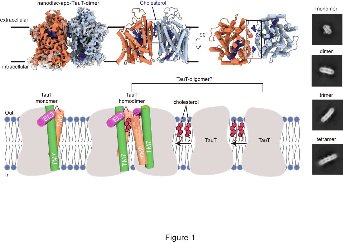 2025年7月4日,中国科学院上海有机化学研究所生物与化学交叉研究中心于杰课题组在Nature Communications杂志发表了题为Dimerization and substrate recognition of human taurine transporter的研究论文。该研究通过冷冻电镜首次发现人源TauT在纳米盘环境中以多种聚合状态存在,并解析其单体和二聚体的高分辨率结构。研究发现二聚体结合方式与SLC6家族中单胺转运体NET的二聚体明显不同,呈现出一种全新的二聚化方式。TauT的二聚化界面是由两个单体的TM5螺旋介导,而两个胆固醇分子的结合进一步的促进了二聚化的形成。除单体和二聚体外,二维分类中还发现了少量可能代表三聚体和四聚体的颗粒,表明TauT在天然膜环境中可能以多种寡聚状态存在。研究认为胆固醇在其中充当“分子胶水”,介导TauT的寡聚化组装(图1)。