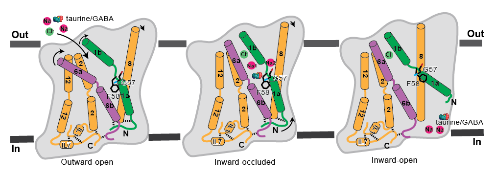 该研究报道了TauT在apo状态、底物牛磺酸或GABA结合状态下的冷冻电镜结构。结合分子动力学模拟和功能实验,研究团队阐明了TauT对底物特异性识别和转运的详细机制。其中心位点可同时结合1个底物、2个Na⁺和1个Cl⁻,诱导构象由开放态转为闭合态。在闭合状态下,两个独特高度不保守的残基Gly57和Phe58位于底物结合口袋内,主要决定了 TauT 的底物特异性。当底物释放时,Gly57和Phe58产生明显的构象变化,使底物和两个Na⁺离子得以释放到细胞质侧(图2)。