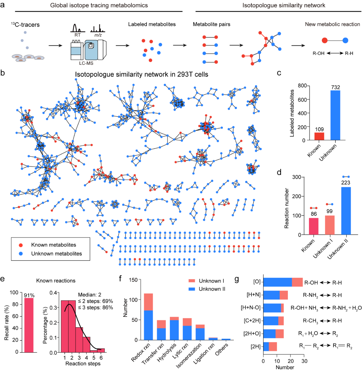 代谢反应是指生命系统中的物质转换,具有重要的生物学意义,如提供能量、传递信号、参与构建生物大分子等。众多的代谢反应构成了生命体错综复杂的代谢网络。然而,目前生物体内的代谢网络是不完整的,这限制了我们对生命活动的认知。探索未知代谢反应,特别是在活体生物体内解析未知代谢物的来源和代谢过程仍然是一个巨大的挑战。针对这个问题,研究团队利用基于质谱分析的稳定同位素示踪代谢组学技术,开发了一种基于同素体分布相似性网络的策略-IsoNet. IsoNet利用具有反应关系的代谢物之间具有相似同素体分布的概念,建立已知与未知代谢物之间的反应关系,并通过原子差和参考反应实现对未知代谢物的从头阐释及新代谢反应的发现。该工作利用IsoNet策略发现了包括氧化还原、转移和水解等300多个不同反应类型的新代谢反应,实现了对未知代谢反应的系统性发现(图1)。