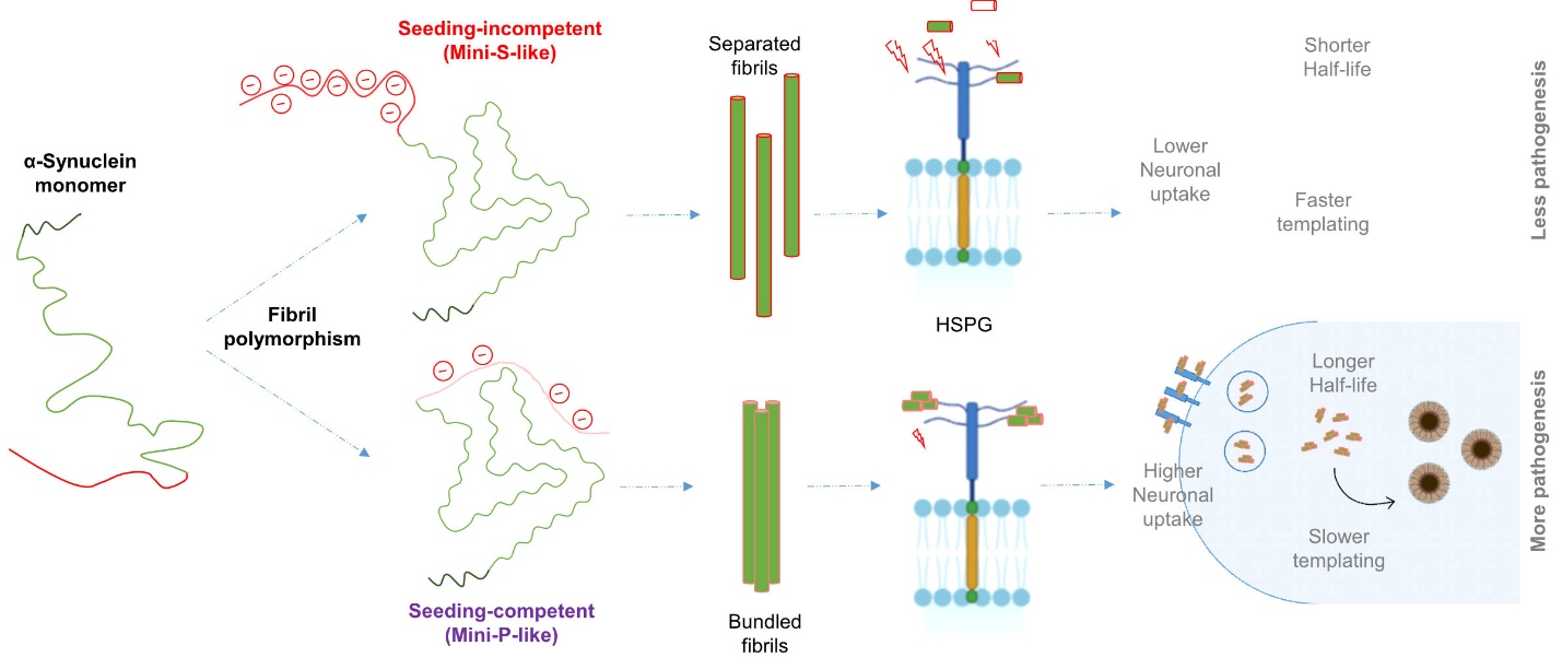 该研究首次揭示了α-突触核蛋白纤维“柔性外壳”通过与核心区表面带正电的氨基酸残疾相互作用,精妙调控其电荷分布,进而影响病理纤维存在形式及性质,决定其进入神经元的效率和细胞内播种能力弱,从而表现出病理传播活性多态性的全新机制,挑战了“纤维核心决定病理特性”的传统观点。这一发现为神经退行性疾病的诊断和治疗提供了新思路: