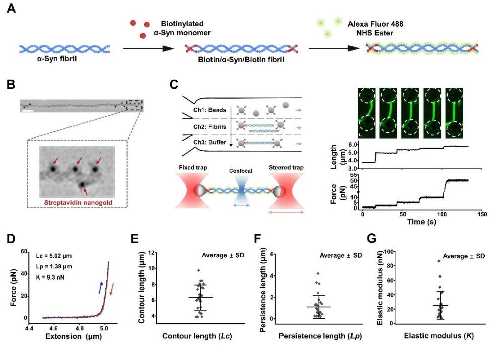 图1. 开发单分子研究方法表征α-syn纤维的力学特性