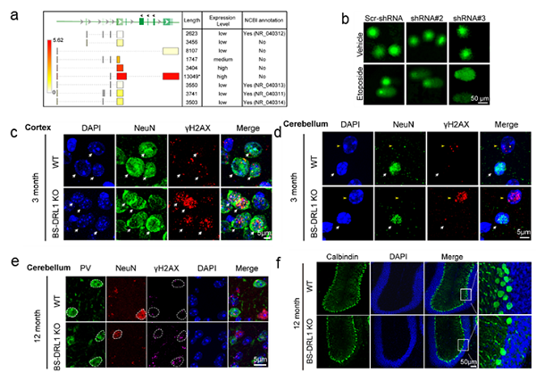 体内体外实验表明,BS-DRL1的缺失会使原代培养的神经细胞,小鼠大脑皮层及小脑中浦肯野细胞在损伤诱导下积累更多的损伤DNA(附图a-d)。且未修复的DNA损伤在生理条件下也会随着小鼠年龄的增加而积累(附图e),进而造成特定神经细胞随着衰老渐进性死亡(附图f)。