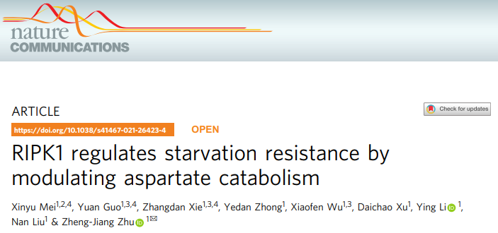 2021年10月22日,中国科学院上海有机化学研究所生物与化学交叉研究中心朱正江课题组在Nature Communications杂志上发表了他们的最新研究成果“RIPK1 regulates starvation resistance by modulating aspartate catabolism”。此项工作发现蛋白激酶RIPK1的一个新的代谢调控功能。该工作通过代谢组学和代谢流分析技术,发现RIPK1缺失条件下,代谢物天冬氨酸会在饥饿的细胞和组织内累积,进而抑制了AMPK信号通路及细胞自噬,使得细胞饥饿应激调控障碍并影响机体存活。