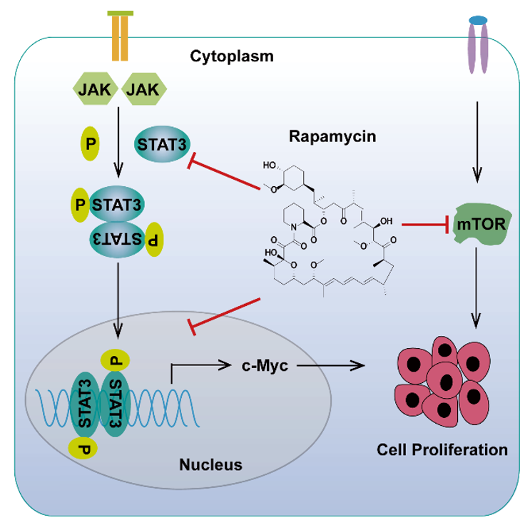 该研究首次表明STAT3是雷帕霉素在细胞内除mTOR外的又一新的功能性靶点。雷帕霉素通过靶向STAT3抑制其转录活性,并影响c-Myc相关基因表达。mTOR,STAT3和c-Myc都是肿瘤治疗中重要的药物靶标,STAT3和c-Myc传统上都被认为“不可成药”。本研究证明雷帕霉素具有同时抑制这三个癌基因的能力,可以发挥“一箭三雕”的协同作用,来达到抗肿瘤的目的。