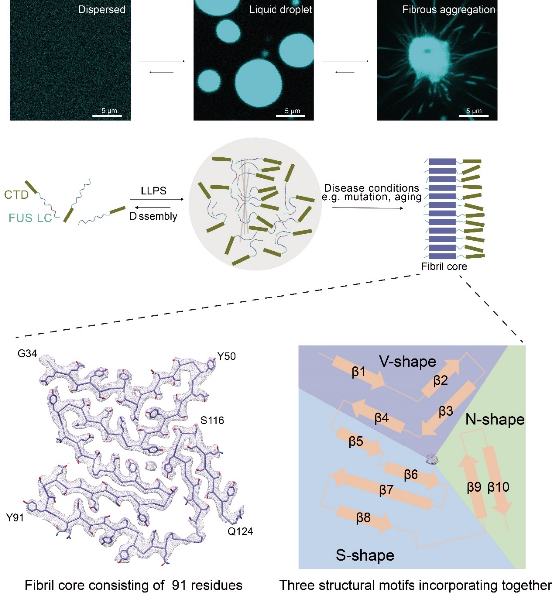 FUS在转录调控、RNA 代谢和 DNA 损伤反应中起到关键作用。刘聪课题组前期的研究研究发现FUS可以通过RAC介导FUS发生液-液相分离形成高度可逆的原纤维1。全长FUS及其低复杂结构域(FUS LC)可以通过多轮接种发生液-固相转化,从而形成高度稳定的淀粉样纤维,并且渐冻人症家族遗传突变可以加速这一液-固相转化过程2。相关研究表明FUS液-固相转化在渐冻人症中的潜在重要病理作用。因此,研究FUS形成高度稳定纤维的分子机制对于了解渐冻人症的发病机理有着重要的意义。