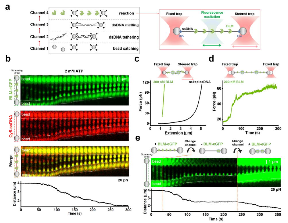 研究人员通过荧光光镊技术发现,BLM能够与ssDNA共凝聚并导致ssDNA的压缩,其在ATP水解的驱动下,可以抵抗数十皮牛的阻力(图2)。此外,BLM还能够通过移除与ssDNA结合的RPA或RAD51蛋白来压缩ssDNA,这也为BLM作为抗重组酶,参与同源重组修复过程中的抗重组功能提供了新的证据。进一步研究表明,单链DNA促进了动态阻滞的BLM凝聚体的形成,导致其可逆性明显降低。