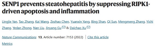 2022年11月22日,中国科学院上海有机化学研究所生物与化学交叉研究中心许代超课题组在Nature Communications 杂志上在线发表了题为“SENP1 prevents steatohepatitis by suppressing RIPK1-driven apoptosis and inflammation”的论文,对这一问题进行了探索。