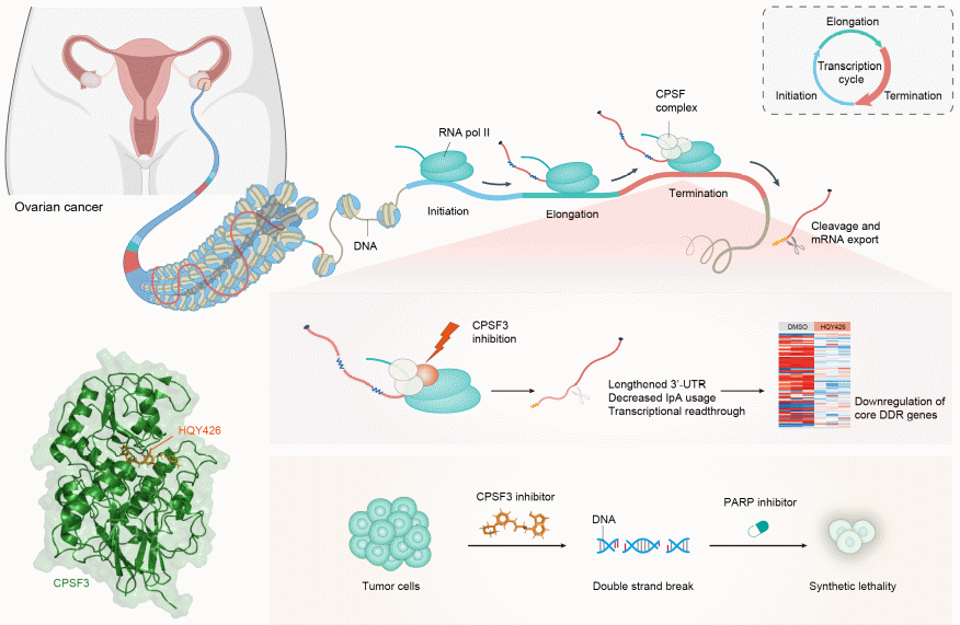 中国科学院上海有机化学研究所生物与化学交叉研究中心、生命过程小分子调控全国重点实验室的谭立课题组曾与仁济医院、上海市妇科肿瘤重点实验室的庄光磊、狄文课题组合作,针对卵巢癌细胞中调控转录延伸过程的关键因子CDK12/13研制了一系列新型激酶抑制剂,并在动物肿瘤模型上取得了很好的抑癌效果。近期,他们又针对卵巢癌细胞中催化mRNA剪接、调控转录终止的CPSF复合物关键组件——CPSF3——研制了新型的小分子抑制剂,并在Science Advances期刊上以共同通讯作者身份发表相关研究论文“Therapeutic targeting of CPSF3-dependent transcriptional termination in ovarian cancer”。
