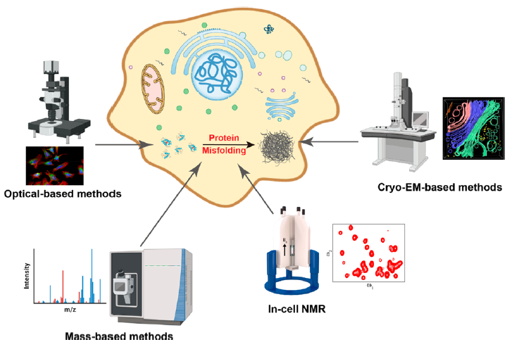图2. 研究细胞内蛋白质错误折叠和异常聚集的四大类技术:基于光学的方法、基于质谱的方法、细胞内核磁共振技术以及基于冷冻电镜的方法
