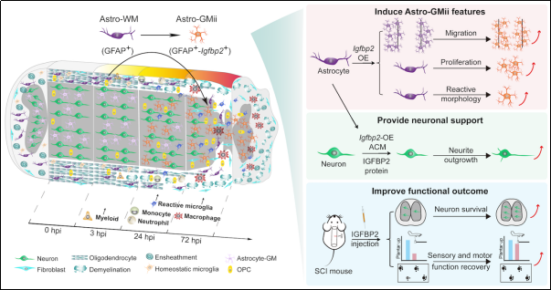 图3. Astro-GMii细胞激活、迁移并表达分泌蛋白IGFBP2促进神经修复的示意图