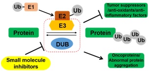 以小分子调节剂改善癌症、炎症或神经退行性疾病中异常的蛋白质稳态。细胞内控制各种蛋白质的浓度和构象的过程,统称为蛋白质稳态。泛素-蛋白酶体系统(UPS)与分子伴侣系统,共同调控着翻译过程中及之后的蛋白质稳态,而UPS对蛋白质浓度的调控尤其重要。泛素化过程是一种可逆而普遍的转录后修饰过程,经其标记的蛋白质被蛋白酶体识别并降解的过程广为人知;泛素化过程也调控着蛋白质的活性、定位、信号传导以及溶酶体或自吞噬降解。蛋白酶体的结构与功能已被广泛研究,其靶向药物Velcade于2003年已获FDA批准。而针对泛素化过程中核心组件——E3连接酶和去泛素化酶——的研究近年来如火如荼,正如20年前学界对激酶组研究新兴起的热潮。本课题组针对癌症、炎症或神经退行性疾病中一些相关的E3连接酶或去泛素化酶,研发新型的功能探针乃至临床候选药物。