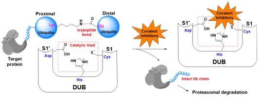 去泛素化酶(DUB)与E3连接酶的功能正相反,负责剪切底物所修饰的泛素链。目前已有5大家族约95个人源去泛素化酶已被发现,其中4大家族都属于半胱氨酸蛋白酶。一些DUB已知的催化结构域晶体结构,揭示了DUB所共有的泛素结合区以及水解催化位点。在过去十年中,DUB作为癌症、炎症或神经退行性疾病的潜在治疗靶标越来越引人注目。一些致癌蛋白(如RAS或Myc)难以通过小分子抑制剂直接靶向,而抑制其DUB能间接降低其水平。正如早期的激酶抑制剂,目前所报道的仅40多个DUB抑制剂中,绝大多数在特异性或活性上并不理想。然后,如今已有相当多的高特异性激酶抑制剂已被发现,逾30个激酶药物已获批,还有逾百候选药物正处于临床评估当中;与此同时,类似DUB的其他半胱氨酸蛋白酶,也已有相关药物处于临床评估当中。这意味着,针对催化结构域彼此类似的DUB家族,系统性地研发出高特异性、高活性的抑制剂只是时间问题。本课题组针对疾病相关的DUB例如USP14、CYLD或A20,研发新型的高特异性、高活性的酶活性抑制剂。