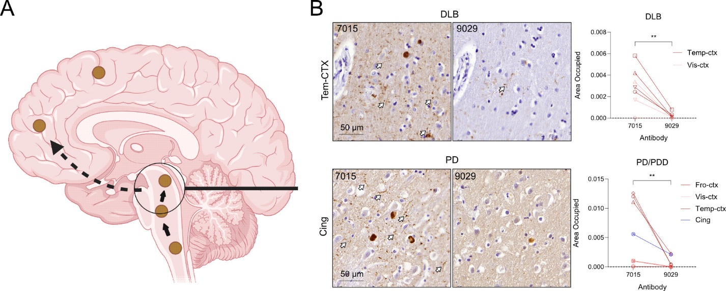 利用构象选择性抗体,研究团队在突触核蛋白病患者的病理新发脑区(如扣带回皮层)中,检测到Mini-P特异性病理信号(图4),提示活跃传播的病理种子可能具有类似的电荷屏蔽和受体结合特性。