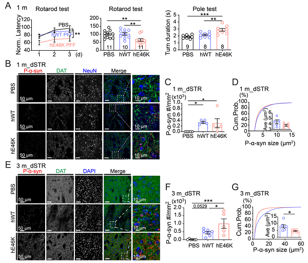 图1 E46K纤维能够引发小鼠早发性运动缺陷,并且诱导内源性WT α-syn形成更多且尺寸更小的病理性纤维聚集。