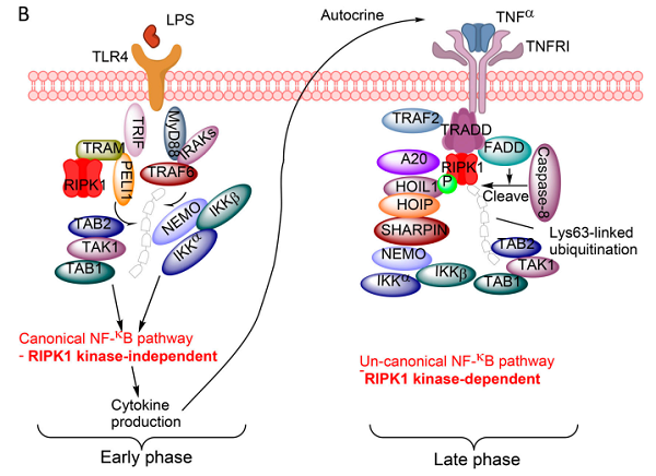 图2. RIPK1在TLR信号通路中双重调控炎症反应的模式图