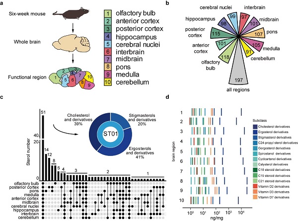 图2. 小鼠功能脑区的甾醇组鉴定和定量分析。(图片来源:Nature Communications)