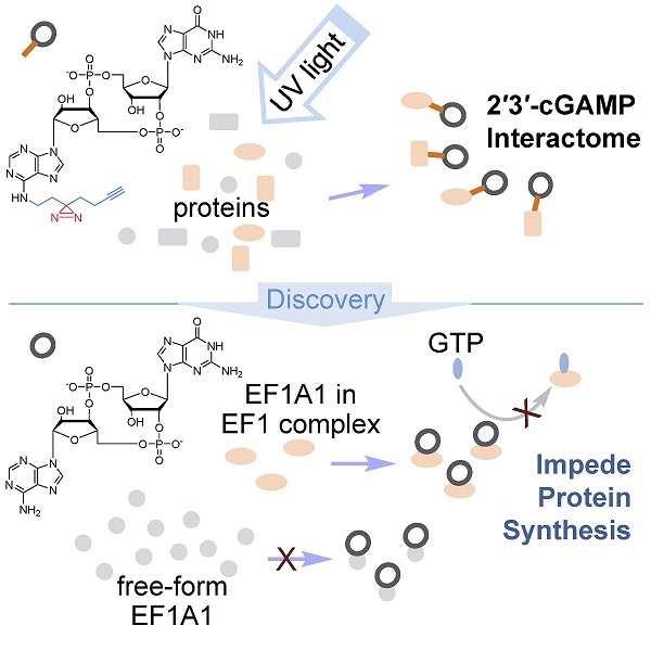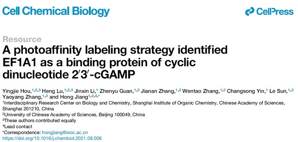 近日,蒋洪课题组利用2'3'-cGAMP为母体的光交联亲和探针,鉴定出EF1A1是2'3'-cGAMP的结合蛋白,2'3'-cGAMP通过结合EF1 complex抑制蛋白翻译过程。这一研究成果于北京时间2021年9月2日发表在国际学术期刊 Cell Chemical Biology。