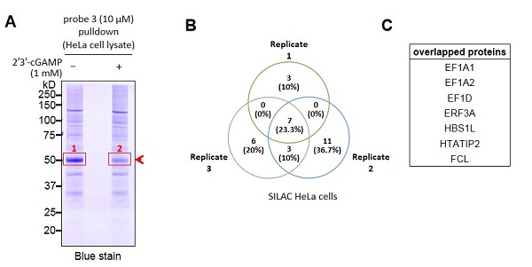 首先研究人员以2'3'-cGAMP为母体合成可光交联、可进行点击化学反应的探针分子。这些探针分子能鉴定出已知靶点STING,并且在与细胞孵育时,也能激起细胞的免疫响应,说明用这些探针寻找潜在靶点有一定的可靠性。探针与Hela细胞裂解液孵育后进行光交联,探针分子就能共价结合到靶蛋白上,接着通过click reaction将biotin接到到探针分子上,之后通过streptavidin beads pull down将与探针分子结合的蛋白进行富集,最后用质谱找到一些2'3'-cGAMP潜在结合蛋白。