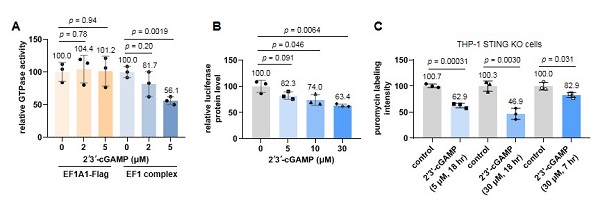 接着,通过生物膜干涉、放射性同位素标记实验,进一步验证2'3'-cGAMP优先与EF1 complex中的EF1A1结合,而不是游离的EF1A1。质谱结果显示,2'3'-cGAMP可能结合在EF1A1与GTP结合的结构域,即在细胞中与GTP竞争性地与EF1A1结合。最后,GTPase assays、体外翻译以及在THP1 STING KO细胞中的实验表明,2'3'-cGAMP能抑制蛋白的生物合成。