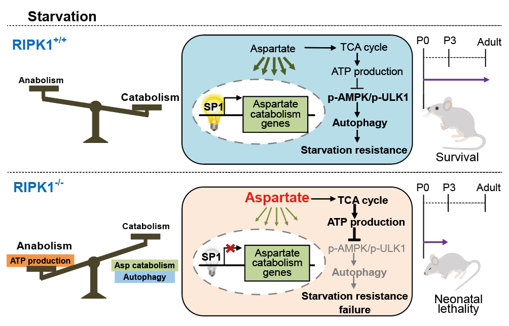 饥饿应激在哺乳动物新生儿存活、肿瘤微环境、及缺血再灌注等一系列生理和病理过程中发挥着重要的作用。代谢调控对于饥饿条件下细胞及机体维持能量稳态及存活非常关键。蛋白激酶RIPK1是细胞存活与死亡的重要调控因子。早在1998年就发现了RIPK1缺失的小鼠会在出生后1-3天内死亡,但分子机制一直不明确。新生小鼠刚出生后,由于脱离了母体营养的供应,处于严重的饥饿状态。在正常情况下,新生儿会启动细胞自噬等代谢反应以抵御饥饿直到获取新的营养供给。RIPK1缺失小鼠的出生致死表型提示RIPK1对饥饿应激调控至关重要。