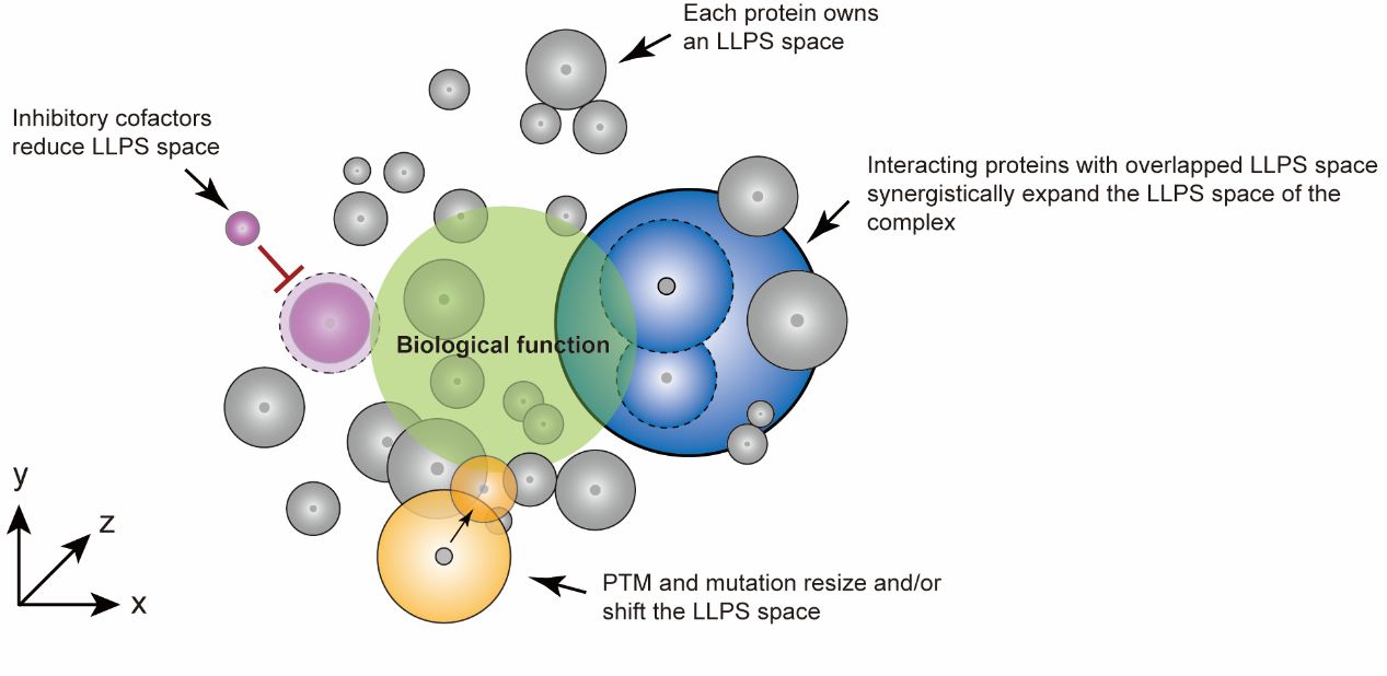 蛋白质液-液相分离(liquid-liquid phase separation, LLPS)介导细胞中多种“无膜细胞器”(membrane-less organelles)的动态组装,无膜细胞器的形成参与到广泛的生命过程中。更为重要的是,特定蛋白质LLPS调控的紊乱会导致蛋白病理性不可逆聚集,并与人类多种神经退行性疾病的发生与发展密切相关。近年来,越来越多具有不同生物学功能的蛋白质被发现在体外具有LLPS能力。不同蛋白质的LLPS对蛋白质浓度、pH、离子强度、温度、拥挤试剂等多种不同条件高度敏感。如何有效快速的在体外找到驱动蛋白质LLPS的关键因素?以及如何系统的比较不同蛋白质之间LLPS的能力?这些问题尚未得到阐述。同时,蛋白质处在细胞内复杂的环境之中,系统研究翻译后修饰,RNA, 分子伴侣,基因突变等胞内因素如何影响及调控不同蛋白质LLPS也显得尤为重要。
