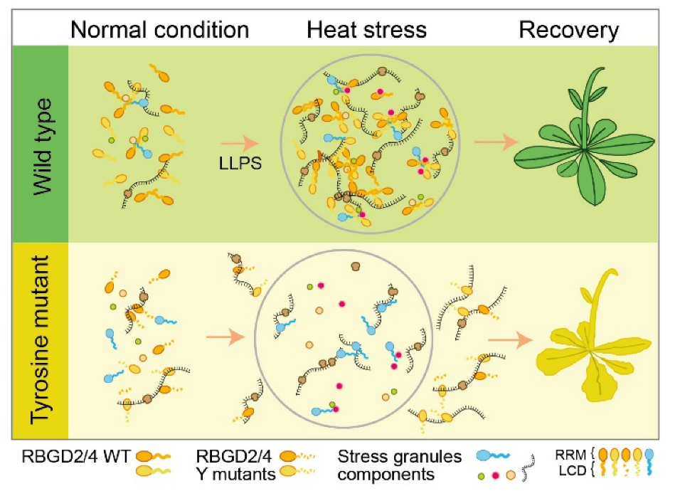 研究人员发现RBGD2或RBGD4突变后降低了拟南芥热胁迫后的存活率。正常条件下,RBGD2/4蛋白质弥散的分布于细胞质和细胞核内;热处理后,RBGD2/4在细胞内形成动态的颗粒状结构。纯化的RBGD2/4蛋白质可在体外受温度或溶液环境诱导产生液液相分离,形成动态的液滴状结构。研究人员进一步发现RBGD2/4低复杂度结构域(LCD,low-complexity domain)中酪氨酸阵列(Tyr residue array, TRA)是驱动RBGD2/4液-液相分离的关键。突变TRA中一半或是全部酪氨酸导致RBGD2/4的体外相分离能力显著降低或缺失,植物细胞内热胁迫诱导产生RBGD2/4颗粒的数目显著降低或消失,并且转基因植物表现出与rbgd2突变体相似的不耐热表型。研究人员发现正常条件下,RBGD2/4蛋白质就与很多应激颗粒组分(如PAB2/4/8)存在相互作用,而热处理显著增加了RBGD2/4结合的蛋白质和信使RNA(mRNA)的数量,其中包括多个热响应转录本(如HSFA2,HSP70等)。