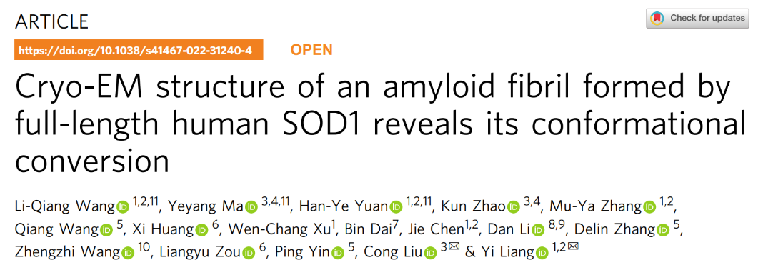 近日,刘聪课题组与武汉大学梁毅课题组合作在Nature Communications在线发表题为“Cryo-EM structure of an amyloid fibril formed by full-length human SOD1 reveals its conformational conversion”的研究成果。在这项研究中,研究人员聚焦ALS的病理蛋白SOD1,通过体外重构的方式模拟其病理聚集过程,并运用冷冻电镜解析其形成病理淀粉样纤维的原子结构,发现了一类全新的病理纤维结构排列模式。相应工作揭示了SOD1通过构象变化形成病理纤维聚集的结构基础,为深入理解多个重要ALS家族性突变加速疾病进程提供了新的研究思路和视角。