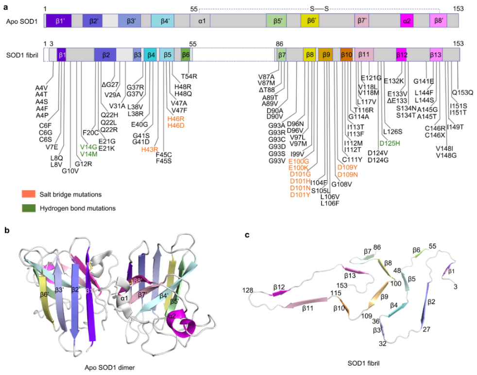 图2:SOD1中ALS家族突变在病理纤维及天然构象中的分布