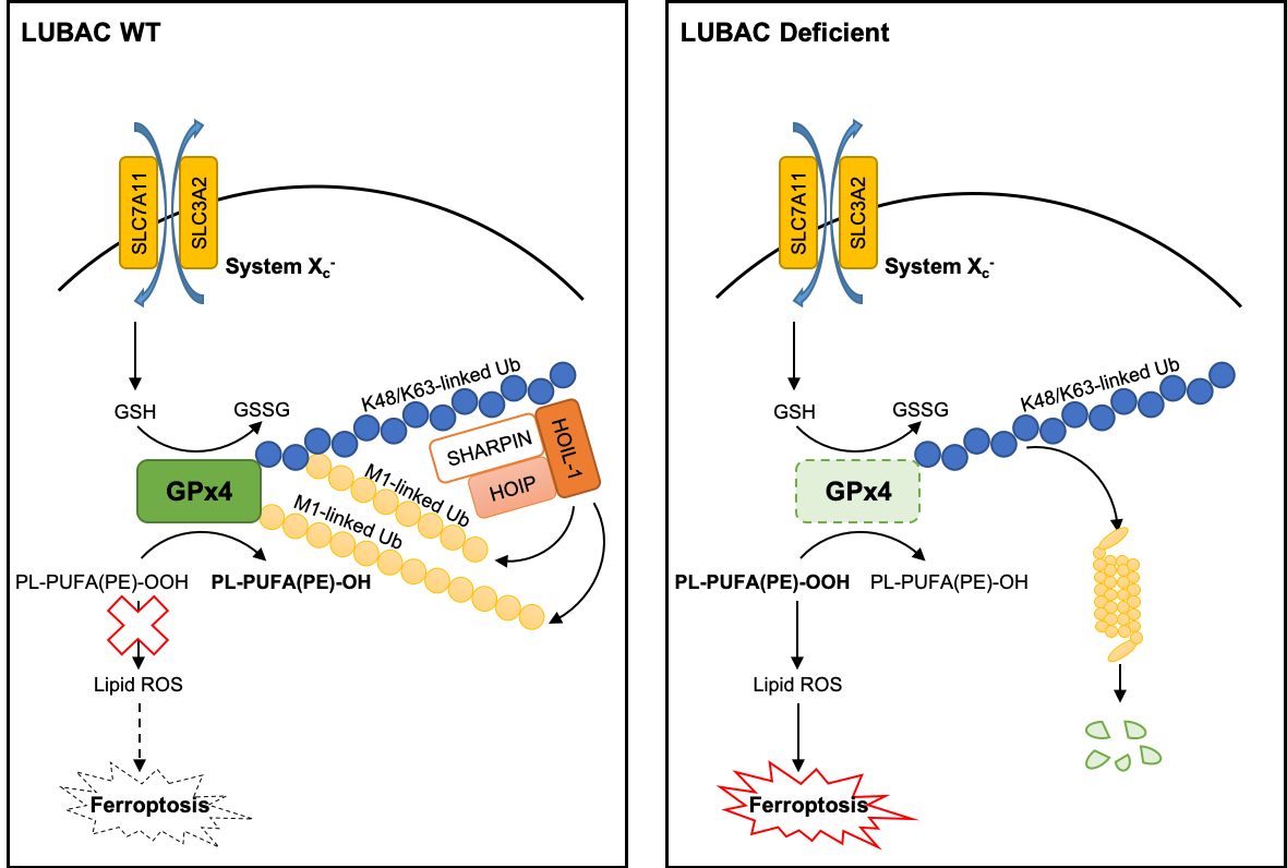LUBAC是目前唯一已知的可以催化形成线性泛素链的泛素连接酶复合物,由HOIP、HOIL-1和SHARPIN组成。LUBAC重要组分的基因缺失会引起严重的免疫功能障碍或者胚胎致死。现有的研究发现,LUBAC催化生成的线性泛素链在调控TNF介导的细胞死亡和炎症信号通路中发挥了重要作用。然而,TNF或者TNFR1的缺失并不能挽救LUBAC缺失引起的胚胎致死表型,这说明LUBAC还调控了其他的重要底物以促进存活。细胞铁死亡(ferroptosis)是一种依赖于细胞脂氧化的细胞死亡形式,其关键调控因子GPx4是一种重要的硒代半胱氨酸蛋白,参与了细胞内氧化还原稳态的调控,它的缺失同样会导致胚胎致死。那么,细胞铁死亡信号通路中是否存在LUBAC的关键底物呢?LUBAC又是否同样参与对细胞铁死亡的调控呢?