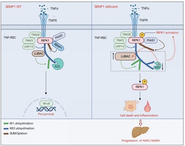 在这项研究中,作者通过小干扰RNA筛选鉴定出SENP1(一种 SUMO 特异性蛋白酶)为 RIPK1 的关键内源性抑制蛋白。他们发现SENP1的表达与NASH患者的病理程度呈负相关。在小鼠当中,肝细胞特异性SENP1基因敲除以RIPK1 激酶依赖的方式产生自发性的NASH相关表型。作者证明 SENP1 缺陷通过在TNF刺激后促进RIPK1的激活,使细胞对RIPK1激酶依赖的细胞凋亡更加敏感。机制上,SENP1 缺失会促进PIAS1介导的RIPK1 的 SUMOylation类泛素化修饰,RIPK1的SUMOylation修饰进而重新编排TNF受体超级复合物(TNF-RSC),通过下调去K63形式泛素修饰的酶A20,以及上调介导M1形式泛素修饰的LUBAC复合物来重新编程RIPK1 的泛素化模式,并最终激活RIPK1,导致细胞死亡及炎症的发生。