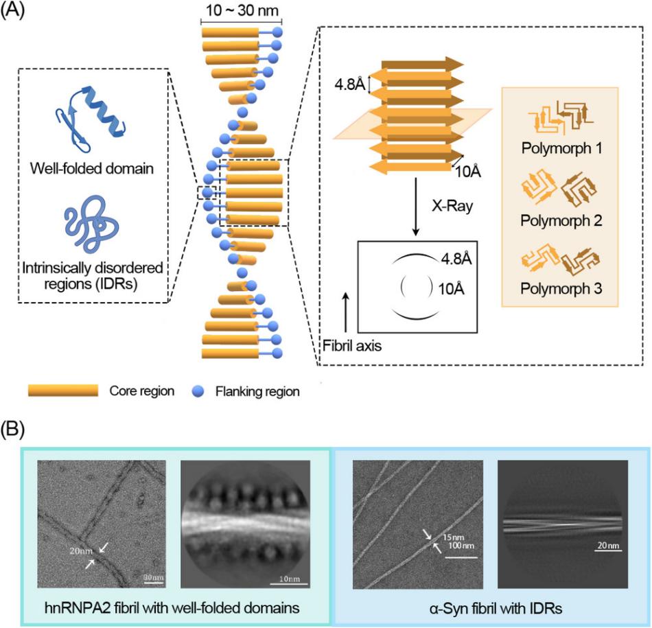 此外,作者讨论了淀粉样纤维的独特结构特征——“原子结构高度多态性”,以及它在理解淀粉样纤维结构与功能关系中的重要性。在不同的神经退行性疾病中,同一病理蛋白可能会形成不同构象的淀粉样纤维。例如,从帕金森病患者和多系统萎缩患者大脑不同区域提取的α-synuclein纤维在结构上存在差异。这可能是导致不同神经退行性疾病病理异质性的原因之一。最后,作者强调了采用和整合新方法深化淀粉样纤维结构功能研究的重要性,并指出了基于淀粉样纤维功能性进行生物纳米材料设计和应用的潜力。