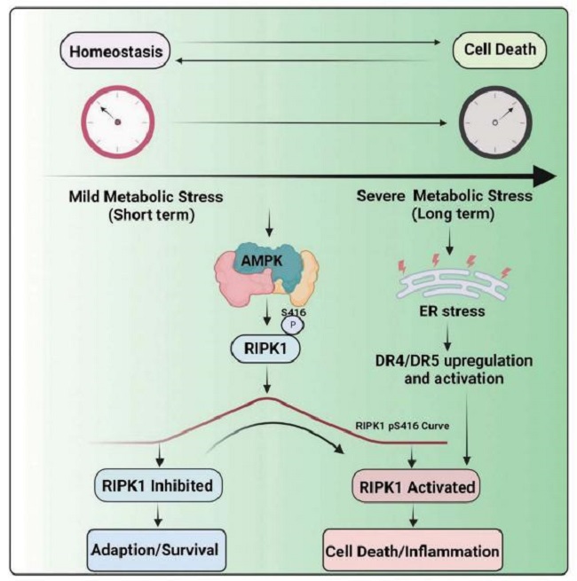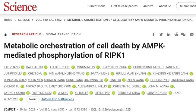 2023年6月29日,中国科学院生物与化学交叉研究中心袁钧瑛、许代超课题组、哈佛医学院魏文毅、中国科学院上海有机所潘李峰课题组、及美国索尔克生物研究所Reuben J. Shaw共同通讯在Science在线发表题为“Metabolic orchestration of cell death by AMPK-mediated phosphorylation of RIPK1”的研究论文,该研究表明代谢应激促进了TRAIL受体介导的受体相互作用蛋白激酶1 (RIPK1)的激活,而AMPK通过在Ser415位点磷酸化抑制RIPK1以抑制能量应激诱导的细胞死亡。