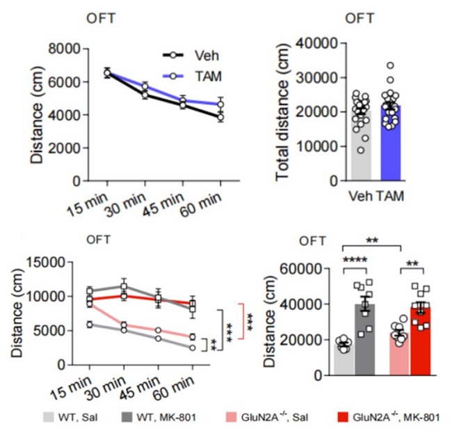 此外,该研究还发现氯胺酮类药物诱导的跟致幻相关的精神分裂样行为则并不依赖于GluN2A,而且成年小鼠中GluN2A的缺失也并不诱导精神分裂样行为(图二),证明了氯胺酮类药物的致幻副作用并非来自对GluN2A的抑制,为开发出来没有致幻效果的快速抗抑郁药物提供了可能途径。