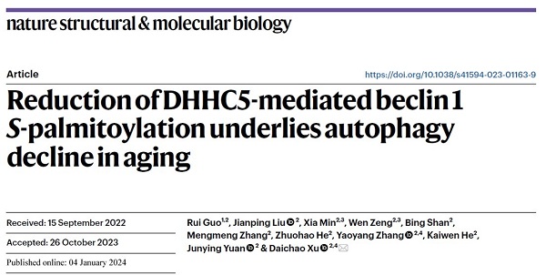 2024年1月4日,来自中国科学院上海有机化学研究所生物与化学交叉研究中心许代超研究团队在Nature Structural & Molecular Biology上发表题为“Reduction of DHHC5-mediated beclin 1 S-palmitoylation underlies autophagy decline in aging” 的研究论文,揭示了脑衰老引起细胞稳态水平降低以及促进阿尔茨海默病的分子机制。