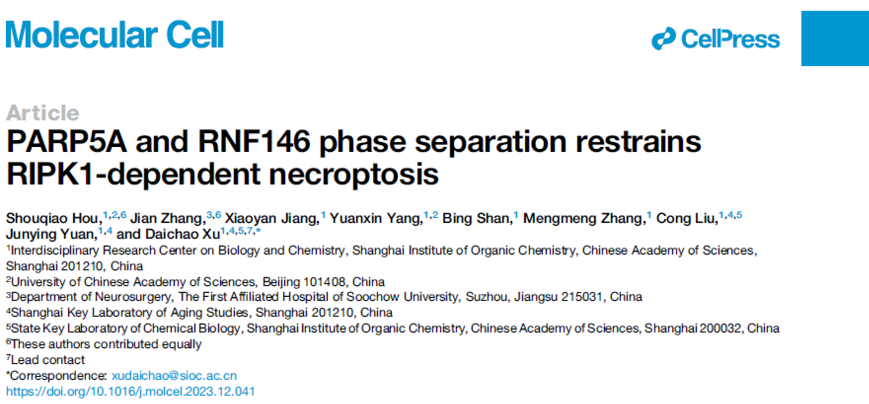 北京时间2024年1月24日,Molecular Cell在线发表了中国科学院上海有机化学研究所生物与化学交叉研究中心许代超研究组题为“PARP5A and RNF146 phase separation restrains RIPK1-dependent necroptosis”的研究论文,报道了新的程序性坏死的死亡检查点并揭示了该检查点以相分离的形式调控程序性坏死的分子机制。