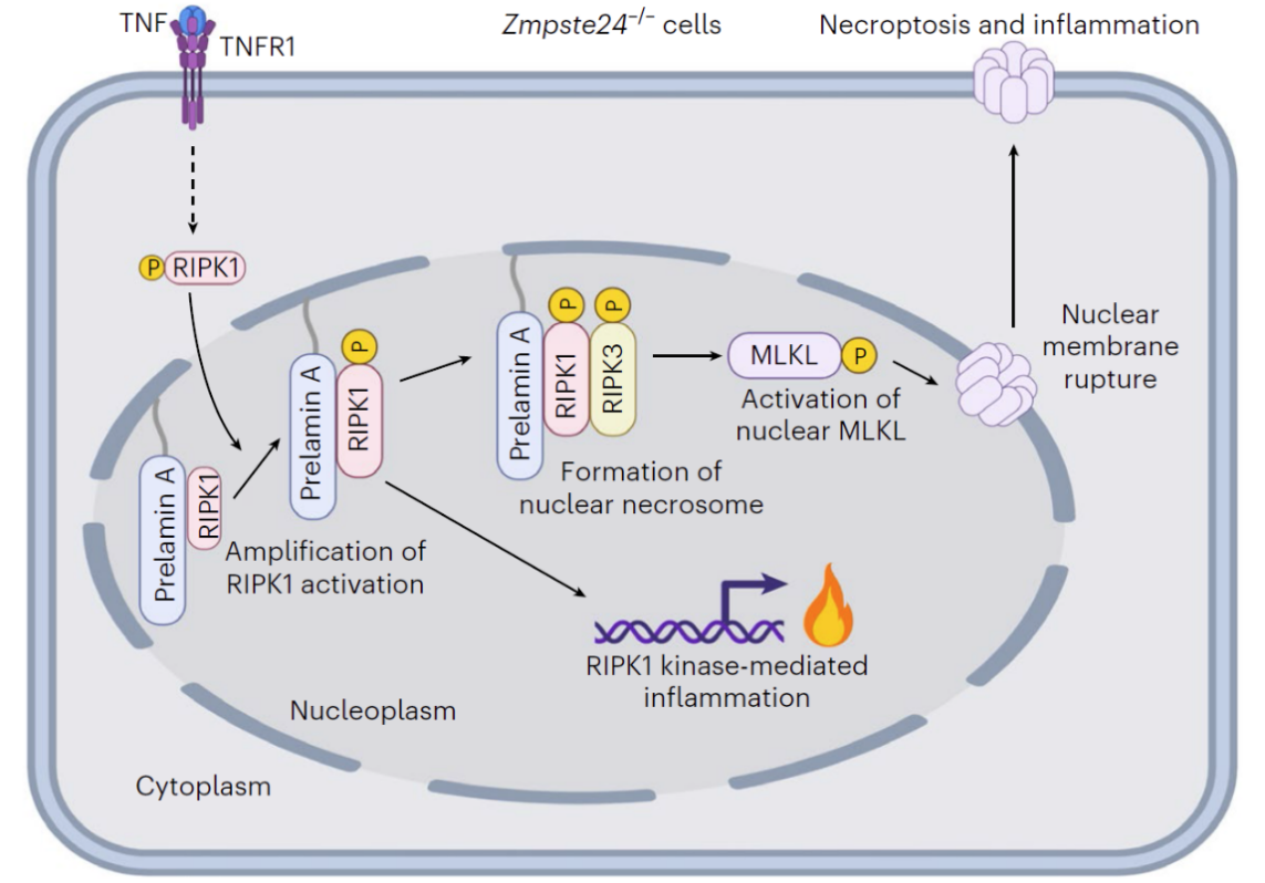 图2. 毒性蛋白prelamin A启动的由核RIPK1介导的非典型细胞核程序性坏死途径的机制模式图