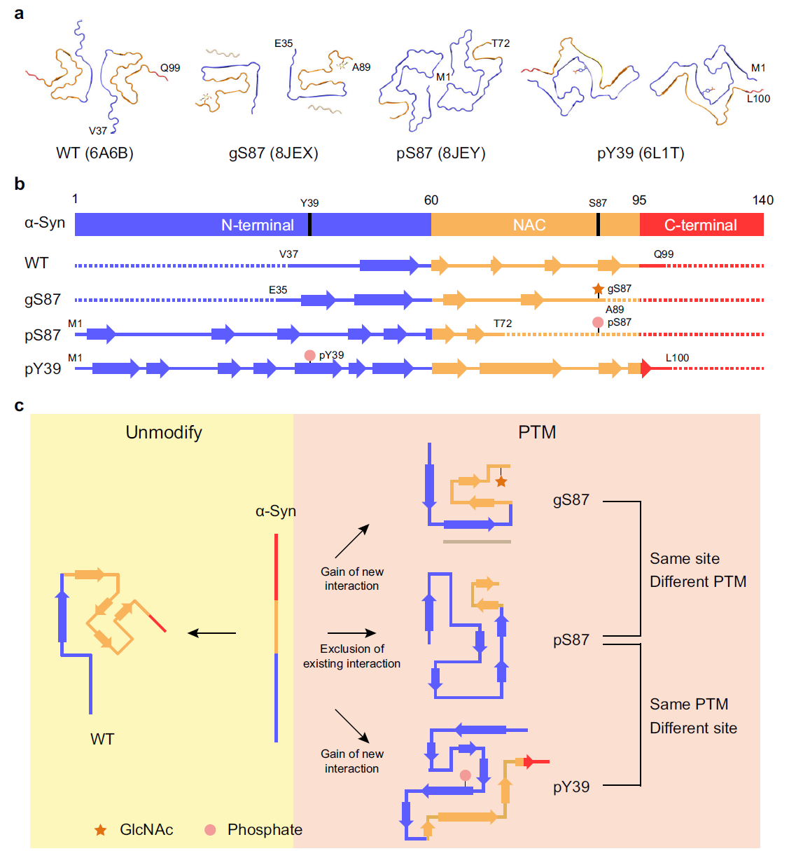 病理性的淀粉样蛋白聚集是神经退行性疾病的关键病理标志,例如α-syn蛋白沉积是帕金森病中路易小体和路易神经突的主要成分。目前已报道α-syn在体内存在多种翻译后修饰,包括磷酸化(Y39、S87、S129等)、糖基化(T72、T75、S87等)、泛素化、乙酰化等,这些翻译后修饰可以调控其聚集动力学、纤维结构和神经毒性等。然而,目前关于α-syn蛋白同一位点的不同翻译后修饰的影响效果依然没有得到充分阐释,也缺乏相应的结构生物学研究进行原子水平的解释。