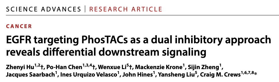 3. Z. Hu, P. H. Chen, W. Li, M. Krone, S. Zheng, J. Saarbach, I. U. Velasco, J. Hines, Y. Liu, C. M. Crews, EGFR targeting PhosTACs as a dual inhibitory approach reveals differential downstream signaling. Sci Adv10, eadj7251 (2024).