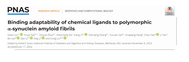 2024年8月22日,来自中国科学院上海有机化学研究所生物与化学交叉研究中心的刘聪课题组在《美国国家科学院院刊》(PNAS)期刊上发表了文章“Binding adaptability of chemical ligands to polymorphic α-synuclein amyloid fibrils”。该研究系统分析了不同化学小分子与帕金森病关键病理蛋白α-突触核蛋白(α-synuclein,α-syn)形成的不同amyloid polymorphs的结合位点与模式,首次揭示了小分子在识别与结合不同polymorphs时的高度可塑性。该工作是在刘聪课题组2023年提出的化学分子与淀粉样聚集互作的基本规律(https://www.nature.com/articles/s41589-023-01370-x)的基础上进一步深化的成果。这项工作进一步拓展和完善了化学分子与淀粉样聚集的互作理论,而且为病理蛋白聚集纤维的分子探针设计、研发以及其在临床应用中的潜力展现了新的前景。