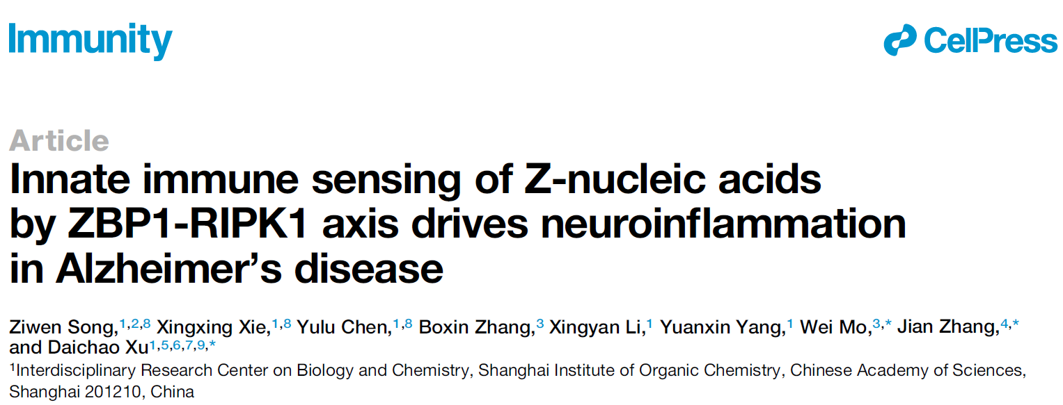 2025年9月2日,中国科学院上海有机化学研究所生物与化学交叉研究中心许代超研究团队在Immunity杂志在线发表了题为 "Innate immune sensing of Z-nucleic acids by ZBP1-RIPK1 axis drives neuroinflammation in Alzheimer's disease" 的研究论文,揭示了氧化断裂的Z型线粒体DNA(Z-mtDNA)可作为ZBP1的新型内源性配体,并驱动小胶质细胞介导的神经炎症过程。这一发现为理解左旋核酸感知以及AD神经免疫调控机制提供了全新视角。