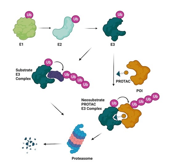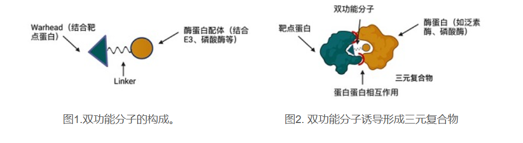 双功能分子通常由两个具有不同功能的小分子组成:其一端结合靶点蛋白(Warhead),另一端常结合某种酶(如E3酶、磷酸酶等),通过诱导靶点蛋白和酶互相靠近,形成三元复合物,实现对靶点蛋白的调控如降解等。