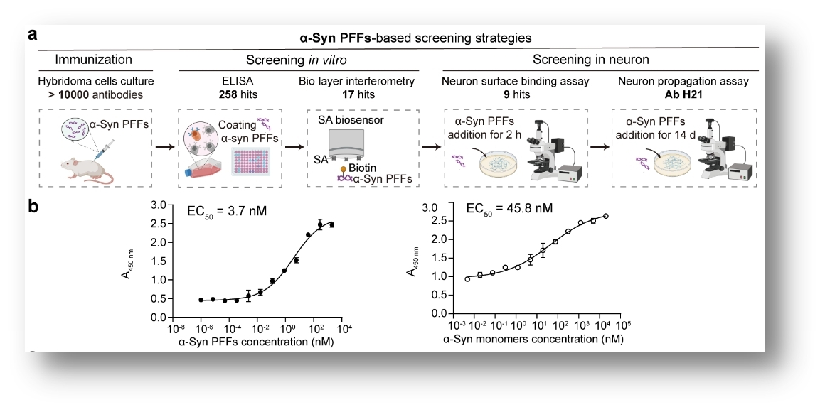 该研究采用人源α-syn预制纤维(Preformed fibrils, PFFs)作为免疫抗原对小鼠进行免疫,建立了一套整合体外筛选与神经元功能验证的多层级筛选策略,最终,从上万...帕金森病(Parkinson's disease, PD)是全球第一大运动障碍性神经退行性疾病,主要病理特征为神经元内含有α-突触核蛋白(α-synuclein, α-syn)淀粉样纤维聚集...