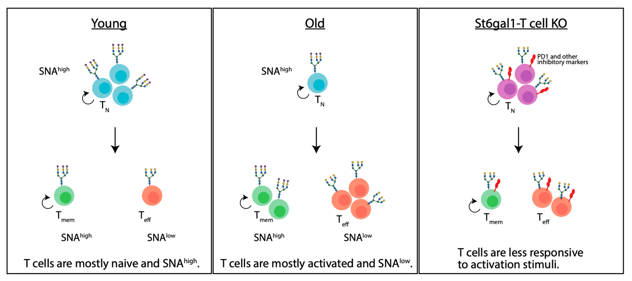 本研究首先检测了不同年龄小鼠体内免疫细胞的糖基化变化,发现衰老个体的CD8⁺ T细胞中α2,6-连接唾液酸显著减少,暗示其可能与T细胞功能衰退相关。而且这种减少并非由于T细胞类群携带修饰的整体下调,而是源于衰老小鼠体内出现了一个几乎不携带唾液酸修饰的新型T细胞亚群(SNAlow),该亚群比例随年龄增长而上升(图1)。进一步表型分析实验表明,T细胞活化可诱导SNAlow群体的产生,而且SNAlow CD8⁺ T细胞主要为短时程效应T细胞,而SNAhigh群体则多为长寿记忆T细胞。
