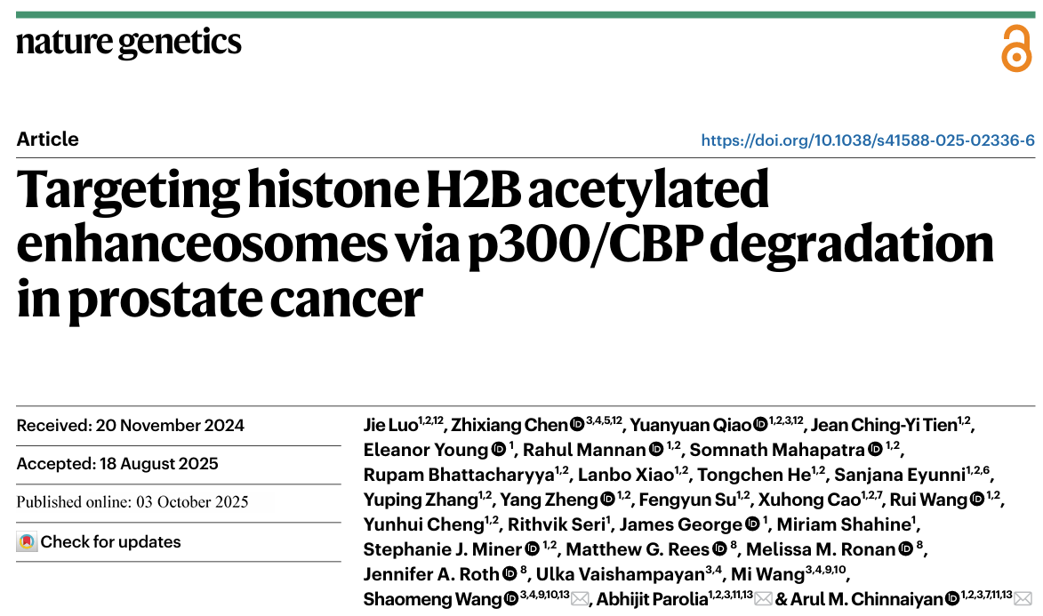 2025年10月3日,密歇根大学转化病理学中心(MCTP)Arul M. Chinnaiyan教授团队与药物化学家王少萌教授团队的合作在Nature Genetics杂志发表题为Targeting histone H2B acetylated enhanceosomes via p300/CBP degradation in prostate cancer研究成果(https://www.nature.com/articles/s41588-025-02336-6)。该研究由MCTP研究员罗杰(Jie Luo)、陈志翔(Zhixiang Chen,现为中国科学院上海有机化学研究所生物与化学交叉研究中心研究员)、乔源远 (Yuanyuan Qiao) 作为共同第一作者,系统揭示了前列腺癌中的关键表观遗传依赖,并开发了新型p300/CBP降解剂,为“增强子成瘾”型肿瘤提供了全新的精准治疗策略。该成果同时被Nature Genetics杂志选为Research Briefing进行专文报道(https://www.nature.com/articles/s41588-025-02354-4)。
