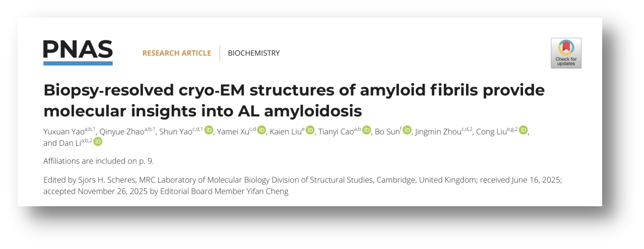 2026年1月,中国科学院上海有机化学研究所生物与化学交叉研究中心刘聪,上海交通大学Bio-X研究院张江高等研究院李丹,复旦大学附属中山医院周京敏合作在 Proceedings of the National Academy of Sciences of the United States of America(PNAS)上发表题为 “Biopsy-resolved cryo-EM structures of amyloid fibrils provide molecular insights into AL amyloidosis” 的研究论文。该研究首次对来自AL患者临床活检样本的淀粉样纤维进行提取与高分辨率结构解析,系统揭示了轻链淀粉样纤维在患者之间的结构差异性以及同一患者不同组织间的结构共性,为AL淀粉样变性的分子机制研究和临床诊断提供了重要依据。
