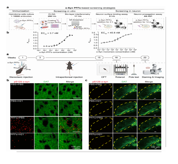 2026年1月22日,中国科学院上海有机化学研究所生物与化学交叉研究中心刘聪、上海交通大学李丹及迈威生物刘大涛团队合作在Cell Reports期刊上发表了题为“A monoclonal antibody targeting the C-terminal of α-synuclein fibrils mitigates pathology in a Parkinson’s disease model”的研究论文。该研究采用人源α-syn预制纤维(Preformed fibrils, PFFs)作为免疫抗原对小鼠进行免疫,建立了一套整合体外筛选与神经元功能验证的多层级筛选策略,最终,从上万个克隆中筛选出最具潜力的候选单克隆抗体H21。进一步,研究团队在体外水平上对H21与α-syn的结合、在细胞水平和小鼠体内水平上对其减轻α-syn病理的效果进行了详细表征,并揭示了其相互作用的分子机制。