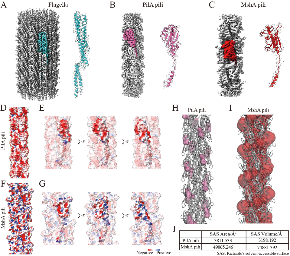 在此基础上,研究团队进一步利用高分辨率cryo-EM对生物膜中的纤维组分进行分类和结构解析。结果表明,S. oneidensis MR-1生物膜中主要存在鞭毛以及PilA pili和MshA pili两类IV型菌毛。研究团队分别解析了这三类纤维的近原子分辨率结构(约3.2 Å、3.4 Å和3.6 Å)。结构分析显示,PilA和MshA虽同属于IV型菌毛,但其表面性质存在明显差异。MshA pili呈现正负电荷交替分布,并具有更大的溶剂可及表面积,可能更有利于其与其他纤维、胞外DNA、蛋白质或多糖等基质成分相互作用,从而促进生物膜中纤维束和三维网络的形成(图2)。